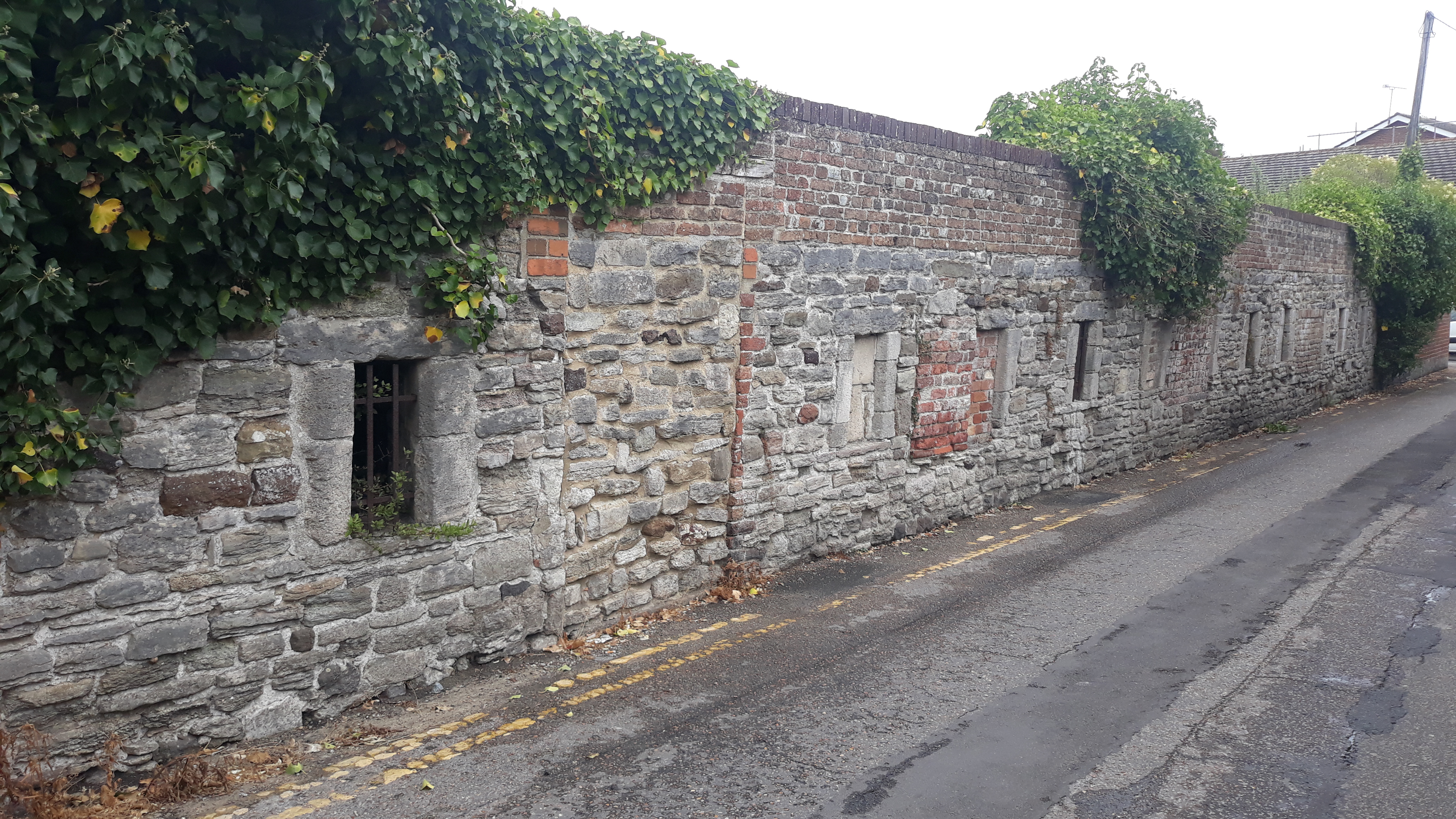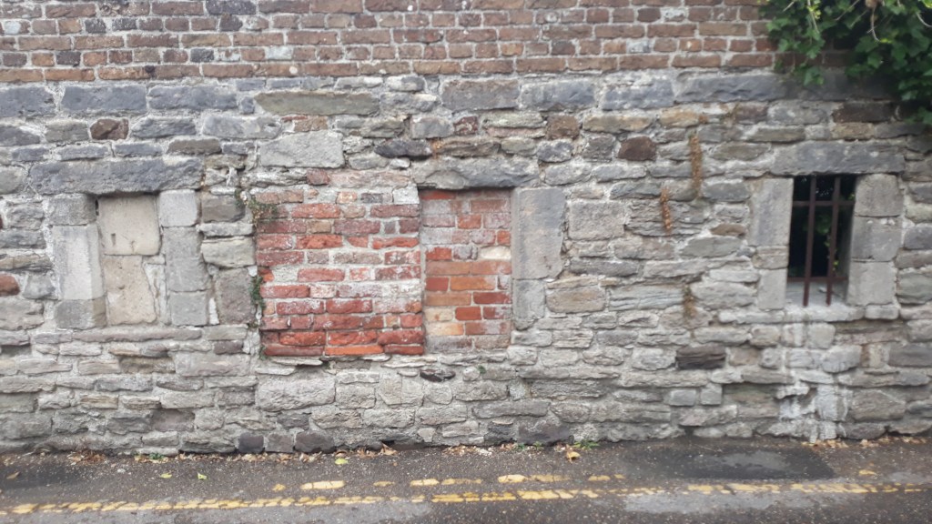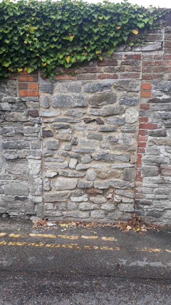 This wall in Wareham (Dorset), stretches around a corner of St John’s Street and is full of infill, brick, limestone and architectural features. It pleasingly curves around the road, marking out a boundary of what is now Sainsbury’s. Boundaries don’t change and many cenutries ago it may have marked the boundary of the Manor House.