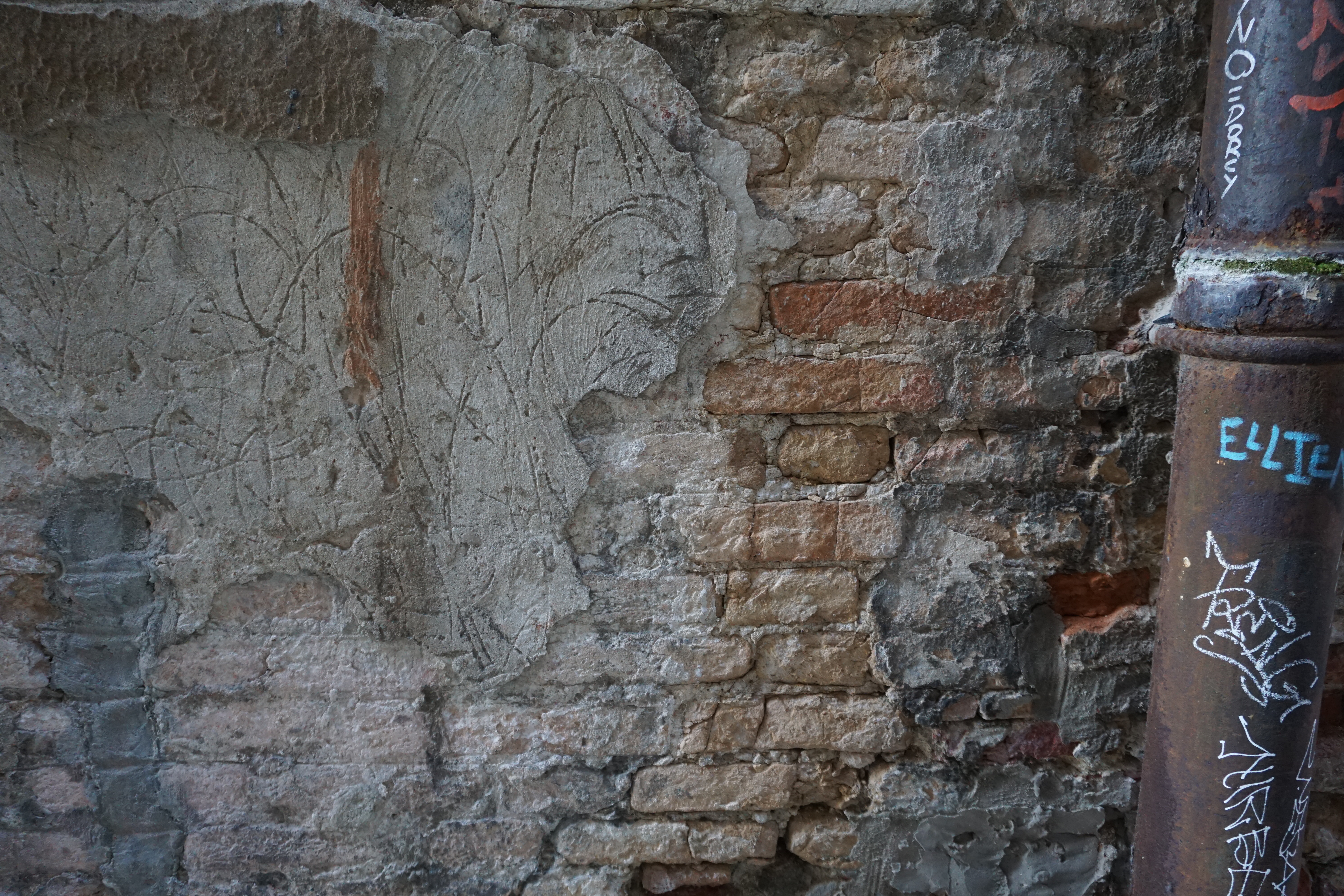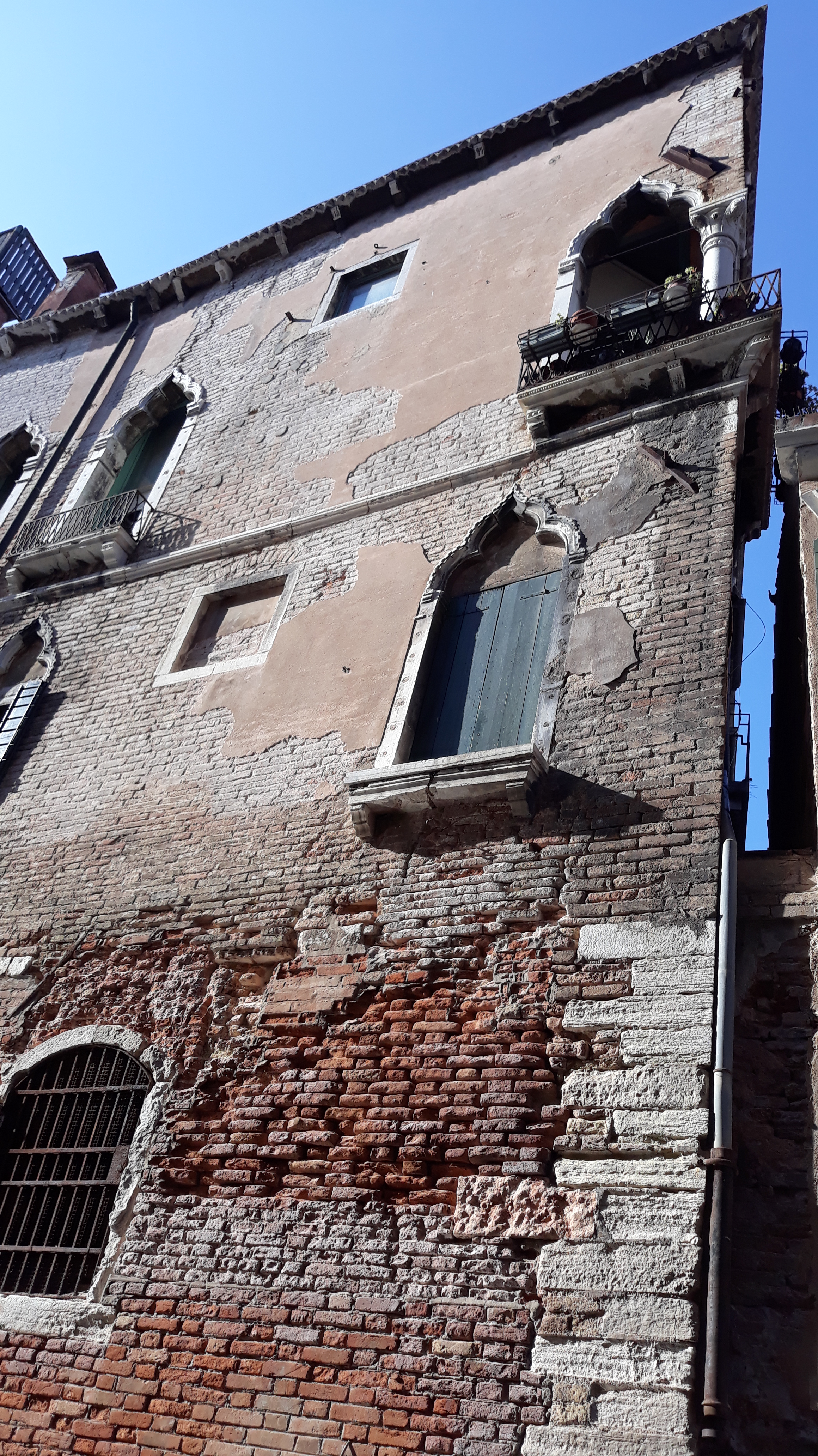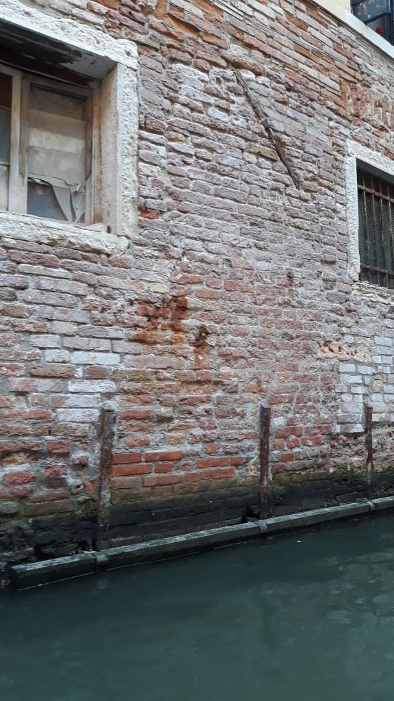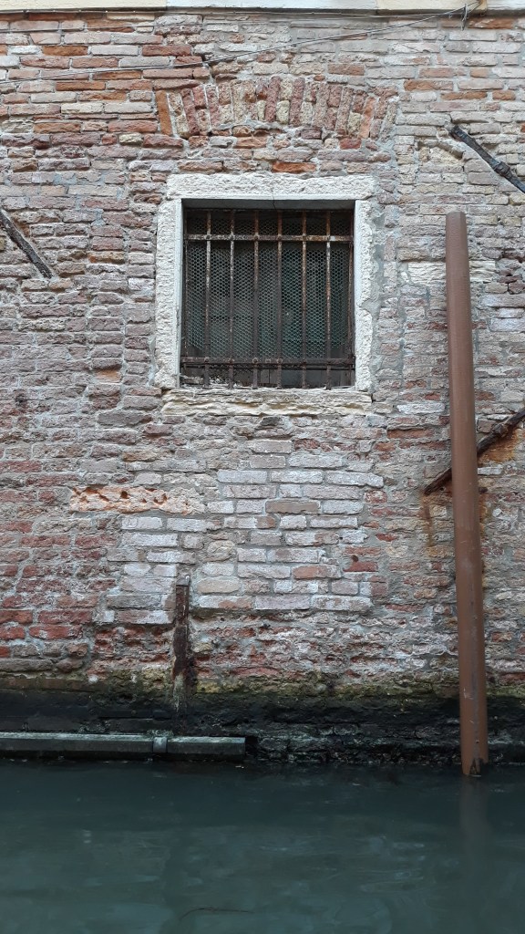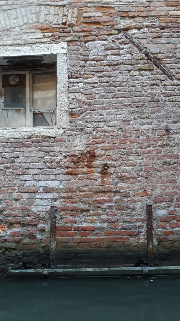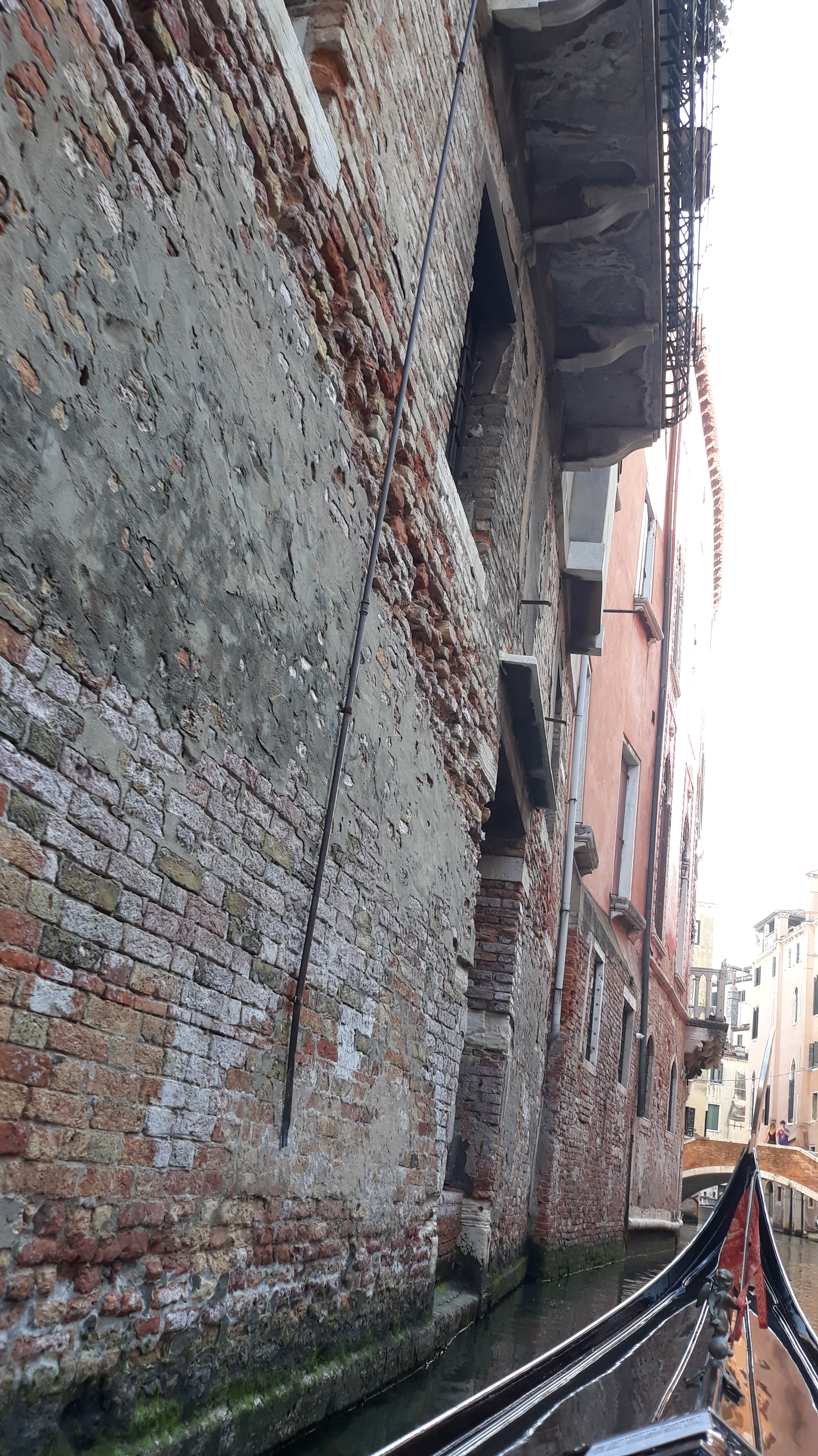 Venice is infamous for romance, whatever the time of year. The buildings, the shapes and forms, the services on the outside of the buildings; it all has an equal balance of beauty and decay. I find the walls are just that. Where ever you go, a canal, campo or calle, there are the plastered areas of wall against bare bricks, infills, erosion, repairs, right next to decorated windows, columns and balconies. I took these photographs, from a gondola, except one. It was the first time I had paid attention to the walls that plunge into the water.